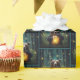 Schwarzer Bär mit einem Glasgefäß voller glühender Glühwürmchen im dunklen Wald.