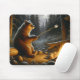 Braunbär, der über einem Lagerfeuer im Wald ein Marshmallow geröstet