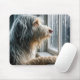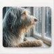 A Bearded Collie dog gazes thoughtfully out a rain-speckled window, its paws resting gently on the sill