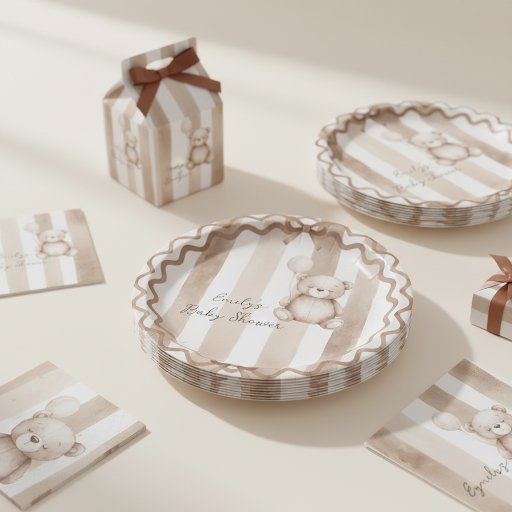 These Bearly Wait paper cups feature a soft teddy bear illustration with warm beige and brown tones. The neutral, classic design adds a cozy woodland-inspired charm to baby shower table settings. Created to coordinate seamlessly with the full Bearly Wait baby shower collection, these cups help achieve a cohesive, refined, and timeless celebration look.