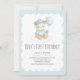 Dieses Design bietet ein Geburtstagsthema "Bär'y First Birthday" mit einem niedlichen Teddybär in pastellblauem Babyoutfit, einen Ballon in der Hand, der auf einer niedlichen Wolke sitzt, skallopierte Ränder und gestreiftes Blau-Weiß-Hinterteil. Ideal für die erste Geburtstagsfeier eines Babys. Dieses Produkt kann leicht personalisiert werden.
