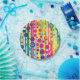 Ein mutiger Entwurf der Polkapunktblasen über Streifen in einem Regenbogen der hellen Farben macht für netten PapierTeller mit einem subtilen alles Gute zum Geburtstagwunsch, der herein bearbeitet wird. Die Mitteilung kann für jede mögliche Gelegenheit besonders angefertigt werden oder völlig gelöscht werden, indem man den Textfeldfreien raum verlässt.