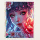 Personalisierter Planer. Ein wunderschönes Mädchen mit rosa Augen, Blume und musikalischen Noten glänzt mit Lila und rosa Blumenakzenten.