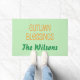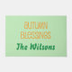 Dieses Design ist ein wunderschöner herbstgepflegter Türmchen mit einem hellgrünen Hintergrund und einem "Herbstsegeln" in einem schönen orangefarbenen Schriftart. Darunter ist der Name Ihrer Familie geschrieben in schönen dunkelgrünen Schriften. Passen Sie Ihre Begrüßungsmatte noch heute an!