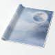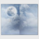 Papier mit einem zauberhaften Fantasiehimmel mit flauschigen blauen Wolken und einem großen schönen Mond. 2 weiße Schwäne fliegen zusammen ab.