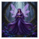 Eine wunderschöne Fee mit fließendem lila Kleid und eine Halskette aus Amatysten mit Violetten in ihren langen lila Haaren und lila Libellen, die eine Violette tragen, steht in einem zauberhaften Wald, umgeben von bunten Pilzen, Blume und mossy, von Weinreben bewachsenen Bäumen.