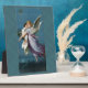 Vintage Kunst mit der Malerei eines Schutzengels, der über die Stadt fliegt und ein Baby in einer Decke hält.
