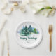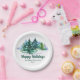 This beautiful custom business holiday party paper plate features gorgeous green Christmas trees in a winter landscape above your customized company name and Happy Holidays. Personalized holiday decor for a corporation or family.