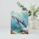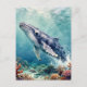 A oceanic themed keeping in touch postcard. The front has a beautiful illustration of an impasto style whale swimming deep in the sea by vibrant colorful coral. On the back you can write your message. Colors used are teal, blue and soft coastal colors.
