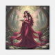Eine wunderschöne Fee mit fließendem rotem Kleid und Schmuck aus Rupien mit Wasserlilien in ihren langen roten Haaren und hellroten Libellenflügeln mit einer Seerosenlilie steht in einem flachen Teich inmitten eines magischen Waldes, umgeben von Seelilien, Lilienpads, rosa Blume und von Rebstöcken.