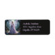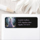 Eine wunderschöne Fee mit einem fließenden Lavendelkleid und eine Halskette aus Perlen mit Rose in ihren langen Lavendelhaaren und lila Libellen, die eine Rose tragen, steht in einem zauberhaften Wald, umgeben von blauen und violetten Blumen und moosbewachsenen Bäumen.