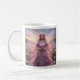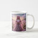 Eine wunderschöne Fee mit einem fließenden rosa Kleid und eine Halskette aus Opalen mit Opalen und Kosmos-Blume in ihren langen rosa Haaren und hellrosa Drachenfliegenflügeln mit einer rosa Kosmos-Blume steht in einem magischen Feld von Kosmos-Blume, umgeben von Blasen an einem Nachthimmel.