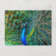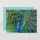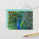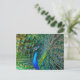 Postkarte mit einem herrlichen Pfau mit seinem offenen Schnabel und Schwanz Federn in einem breiten Fächer geöffnet, zeigt seine wunderschönen irisierenden grünen, blauen und bronzefarbenen Federn. Einzigartige Karte für Vögel- und Naturliebhaber. Foto aufgenommen in Arcadia, Kalifornien.
