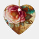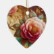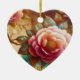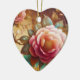Pink flowers are on the front and on the back of a heart-shaped ceramic Valentine tree ornament.