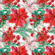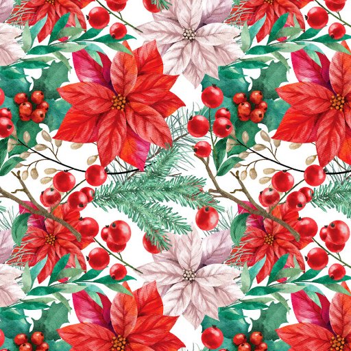 Watercolor Christmas design of red and white poinsettias, pine branches, hollies and red berries.