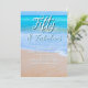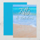 Meilenstein Geburtstagsparty für einen Erwachsenen. Die Einladungsvorlage enthält einen schönen Hintergrund der Strandszene. Ihr Alter ist oben geschrieben in weißer Schrift über tropisch blaues Meerwasser. Der Absatz der Party-Informationen besteht aus mehr weißem Text. Das Meer und der Strand mit Sand sind ideal für jeden Sommergeburtstag oder Party für einen Strandliebhaber. Eine galoppierte Kante mit Leinenpapier ist eine von vielen Möglichkeiten, die den Preis beeinflussen wird.