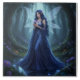 Eine wunderschöne Fee mit einem blühenden dunkelblauen Kleid und eine Halskette aus Saphiren mit Saphiren in ihren langen dunkelblauen Haaren und durchsichtigen, drachenähnlichen Flügeln, die einen Oster tragen, steht in einem flachen Teich inmitten eines magischen Waldes, umgeben von Asterern, orangefarbenen Pilzen und Bäumen, die mit Reben, Blume und Pilzen bewachsen sind.