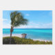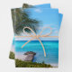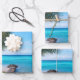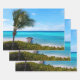 Wrapping paper sheets with a scenic photograph. A clear blue ocean with a white sandy beach. A palm tree swaying in the wind.