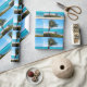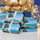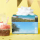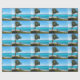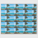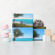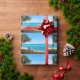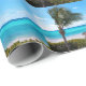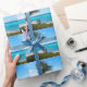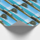 Wrapping paper with a scenic photograph. A clear blue ocean with a white sandy beach. A palm tree swaying in the wind.