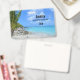Name badge with a scenic tropical photograph. A secluded beach with white sand and turquoise water.