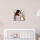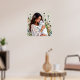 Beautiful whimsical poster. Wall art with an illustration of a woman holding a white fluffy cat surrounded by dandelions, The picture has a crochet style fabric look.