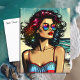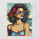 Behalt und Touch mit einem Freund oder Familienmitglied mit diesem hübschen ai-erzeugten Bild einer hübschen Dame am Strand mit einer Sonnenbrille mit einem Ozean Beach Hintergrund Comic Stil Pop Kunst.