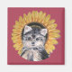 Einzigartiges Bild eines schönen Yorkshire Terrier Dog, der vor einer Sonnenblume auf bordeauxrotem Hintergrund sitzt.