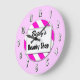 Eine einzigartige Wanduhr, die den Beauty Shop in Blockbriefen liest, mit Platz für Ihren Namen in Retro-Skript auf einem rosa und weiß gestreiften Hintergrund, umgeben von weißen und schwarzen Buchstaben auf Rosa.