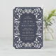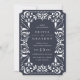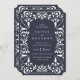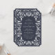 Elegante Vintage Hochzeitseinladungen in reichen Mitternachtsblau mit verzierten Details, die das Aussehen von geschnittenem Papier in einem papel picado Stil. Wählen Sie die Ticketform aus, um die einzigartige Form der Details im Deko-Stil zu ergänzen.
