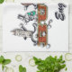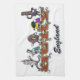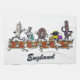Die Sehenswürdigkeiten des Bedeckens, in größerem Manchester, England, stylised Cartooncharakters seiner Sehenswürdigkeiten und townscape, einschließlich (von links nach rechts) den Whitehead Glockenturm kennzeichnend Versionen eines, ein Transport für die größere Manchester- (TfGM)Bushaltestelle, die ein JD hält, trägt Drawstringtasche, eine Blutwurst des traditionellen Bedeckens und tragende Taschen einer Metrolink Tram vom weltberühmten Bedecken-Markt und vom Felsen und schließlich, das Schalen-Monument zur Schau, das ein Barett von einem Lancashire Fusilier hält. Bedecken wird heraus im traditionellen roten Ziegelstein und im Sandstein, mit BaumwollBlumenverschönerung buchstabiert.