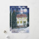 Weihnachts-Weihnachtskarte mit einer handgemalten, schneebedeckten Aquarell-Hütte, die mit einem fröhlichen Kranz an der Tür und farbenfrohen Märchenleuchten geschmückt ist. Der ideale Weg, um Ihre Familie und Freunde die besten Wünsche für die Weihnachtszeit zu schicken.