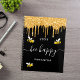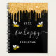 Mit fröhlichen, lächelnden, gelben und schwarzen Hummeln dekoriert. Ein schicker schwarzer Hintergrund und Imitate goldene Glitzer Tropfen, Farbe tropfend aussehen. Weiße Schrift mit Swashes und den Text: Bee Happy. Personalisieren und fügen Sie Ihren Namen und ein Jahr. Ideal für Schule, Arbeit oder Organisation Ihres Privat-/Familienlebens.