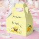 Dieses hübsche Gefälligkeitskastendesign hat ein gelb-weißes Hintergrundmuster. Auf den vorderen und hinteren Paneelen befindet sich ein brauner Korbkorb voller Zitronen. Der Text lautet "Bee Happy!", mit einer kleinen Biene. Die Seitentafeln bestehen aus zwei ganzen Zitronen und einer Hälfte Zitrone. Alle Texte können individuell angepasst werden.