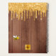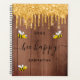 Mit fröhlichen, lächelnden, gelben und schwarzen Hummeln dekoriert. Eine rustikal braune Holzstallmauer, ländlicher Stil als Hintergrund. Dekoriert mit Imitaten vergoldeten Glitzer-Tropfen, Farbe tropfend aussehen. Schwarz geschriebenes Skript mit Swashes und Text: Bee Happy. Personalisieren Sie Ihren Namen und ein Jahr. Ideal für Schule, Arbeit oder Organisation Ihres Privat-/Familienlebens.