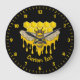 Honigbiene mit offenen Flügeln Symbol über Bienenstock und Honig fällt. Benutzerdefinierte Hintergrundfarbe. Eigener Text.