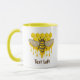Honey bee with open wings icon over bee hive and honey drops. Custom text on both sides.