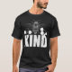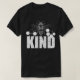 Dieser schwarze T - Shirt enthält das Wort "KIND" in einem großen, bedrängten weißen Schriftart. Über dem Wort wird eine detaillierte Linie gezeichnet, die zwischen stilisierten Weißwabenwaben positioniert ist. Das Design fördert eine einfache, aber kraftvolle Freundschaftsbotschaft, die mit den Bildern von Bienen und Honigwaben in Verbindung steht.