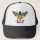 Dieses Hutdesign zeigt eine verzierte Biene auf der Vorderseite mit dem Werk "kind" unten in einem Skript-Schriftart geschrieben. Das Bienendesign ist schwarz und gelb auf einem hellweißen Hintergrund.