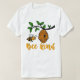 Dieser weiße T - Shirt zeigt eine bezaubernde Abbildung eines Cartoon, der in Richtung eines traditionellen Strohhalms fliegt, der von einem Zweig mit grünen Blätter hängt. Unterhalb der Abbildung sind die Worte "Bienen" in einem warmen orangefarbenen Skript geschrieben. Das Design fördert eine Botschaft der Freundlichkeit und der Wertschätzung der Natur.