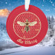 Dieses festliche Schmuckdesign besticht durch eine königliche Biene auf einem Kreis von Wabenkolben, darunter die Buchstaben Bee Merry. Dieses Design ist eine Hommage an unsere oh-so wichtige Bienenkultur, während es auch fröhliche Wünsche sendet. Dieses Design ist gold und schwarz auf einem roten Hintergrund.