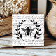 Dieses Design zeichnet sich durch ein Schwarz-Weiß-Bild einer Biene aus, umgeben von einem klassischen Lorbeerkranz, auf einem Hintergrund Vintager, schwarz-weißer französischer Handschrift.