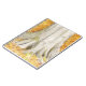Farbstift zeichnend von den Wurzeln eines Buchenbaumes umgeben vom Teppich gefallener Herbstblätter aus Gold.