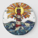 Diese Runde zeigt eine stilisierte Abbildung eines rot-weiß gestreiften Leuchtturms, der inmitten wirbelnder Blau- und Weißwellen stehend ist. Hinter dem Leuchtturm strahlt ein großer, lebendiger Sonnenbrand in warmen Gelbtönen und Orangen aus. Die Uhr hat klare Zahlen und schwarze Hände. Das Gesamtbild ist kühn und grafisch, was ein Gefühl maritimer Abenteuer und sonnige Tage am Meer hervorruft.