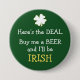 Hier ist ein lustiger Knopf für St. Patrick's Day! Es zeigt ein weißes Kleeblatt ganz oben, mit dem Text unten in weiß und gold "Hier ist die DEAL. Kaufe mir eine BIER und ich bin IRISH." Das Bild und der Text sind natürlich auf einem grünen Hintergrund platziert!