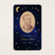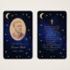 Eine Gedenkkarte mit Vintager Luft für eine Beerdigung. Auf beiden Seiten hat es einen blauen Nachthimmel-Hintergrund mit goldenen Sternen und halbmondfarbenem Mond an den Rändern. Auf der Vorderseite befindet sich ein Vintages ovales Foto mit goldenem Rahmen und goldenem Text. Der Name ist in einem eleganten kalligrafischen Skript geschrieben. Auf der Rückseite ist ein Gebet, in goldenen Kappen, mit einem goldenen Kreuz darüber. Das Foto der Sternennacht ist von Felix Mittermeier aus Pixabay und ist für kommerzielle Nutzung kostenlos. Das Platzhalter-Foto, ein altes Sepia-Portrait eines jungen Mannes aus dem Jahr 1882, ist öffentlich zugänglich; es wurde von Jody LaGreca bei Public Domain Pictures angeboten.