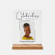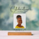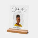 Das moderne Plexiglas (mit oder ohne Holzblock-Halter) enthält den Wortlaut "Celebrating the Life of", das Foto, den Namen und das Geburtsdatum. PASSENDE Artikel in unserer Sammlung.