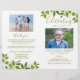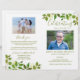 Kostengünstiges Grabdenkmal-Programm, das auf der Vorderseite ein Foto Ihrer Lieben, ihren Namen, Daten, den Gedenkort, das Veranstaltungsdatum und das elegante grüne Blattwerk zeigt. Im Inneren ist eine Gedenktafel, und die Dienstordnung; und auf der Rückseite ein anderes Foto, ein Dankeschön und der zweite Ort für nach der Beerdigung. BITTE BEACHTEN SIE: Diese sind als flaches Qualitätspapier erhältlich, das Sie selbst falten müssen.