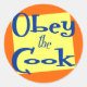 Ein Aufkleber, der Obey das Cook-Slogan in einer funky Retro-Schriftart in blau auf gelbem und orangefarbenem Hintergrund liest. Du musst dem Koch gehorchen, wenn du zu essen will! Für Koch mit einer Einstellung!