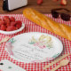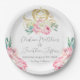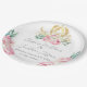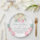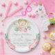 Dieser spezielle Hochzeitsplatz hat ein Märchen-Thema mit rosa und weißen Blume. Weiße Rosen in Aquarelltönen und rosafarbene Pfannkuchen prägen die unteren Ecken. Eine goldene Aschenputtel-Kutsche steht oben.