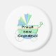 Eine Babykutsche in blau, grün und gelb und Text, die "Proud New Oma" auf den Baby-Ankündigungs-Buttons.